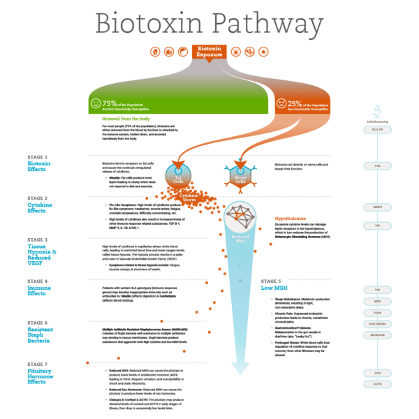Worse still… The Biotoxin Pathway illustrates the process from infection to full-blown CIRS. As cytokines are released in response to the infection, they attack thy hypothalamus—including the pituitary gland, which regulates the thyroid.